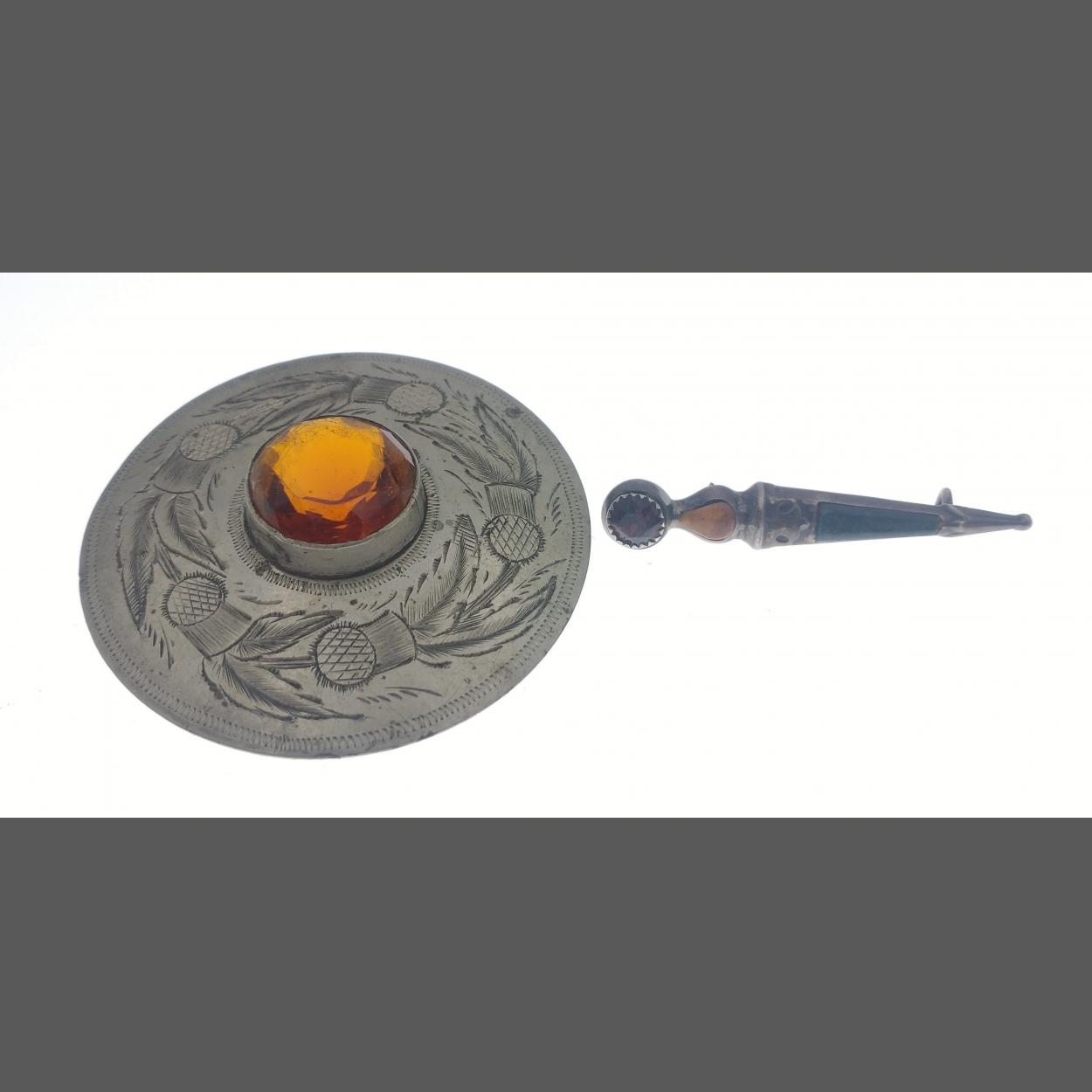 A SCOTTISH LOT ! A nice plaid brooch with a 'dazzling' amber style stone centred on unmarked white metal - dimension 6cm diameter approx with a small VINTAGE Silver Sterling stamped Dirk imbedded with small agate stones with a purple amethyst stone atop - dimension 5cm in length weight 4.12g gross