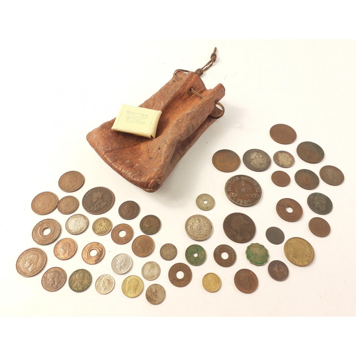 An interesting small collection of coinage in an old antique money bag. Includes 1835 William IIII East India One Rupee, a 1909 Deutsch Ostafrika 5 hjeller in good grade, 1922 East Africa Half Shilling, 1913 Australian penny and others