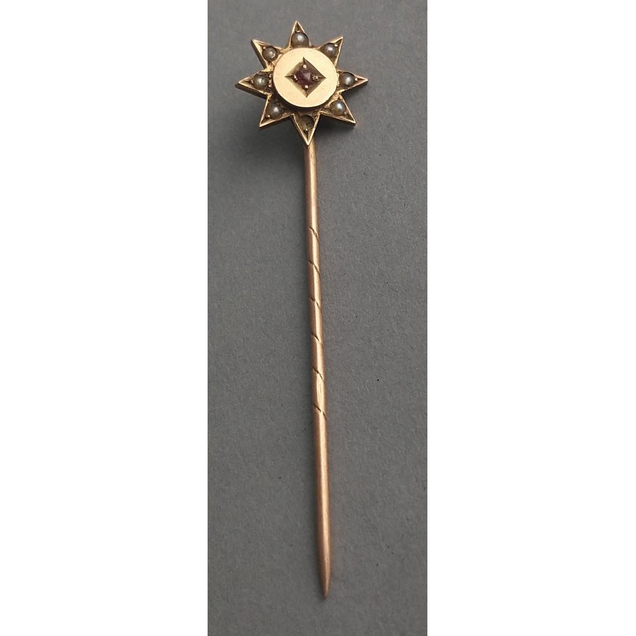 A 9ct gold stick pin with ruby and seed pearls. Gross weight 1.5g approx