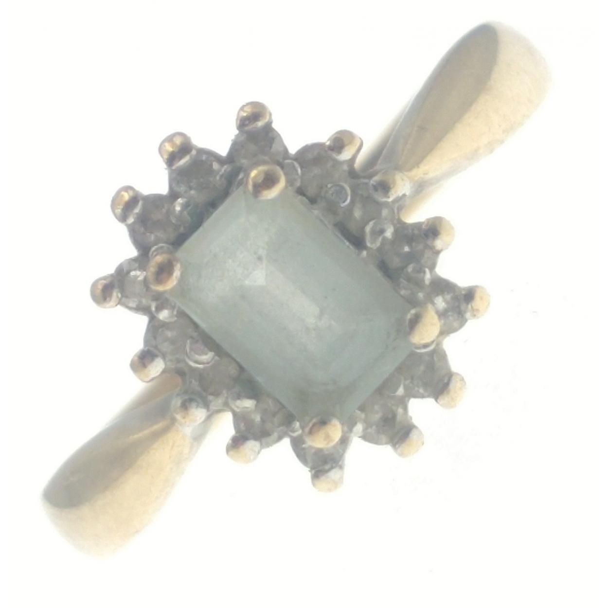 A 9ct hallmarked yellow gold ring set with clear stone surrounded by diamond chips. Size O and gross weight 3g approx