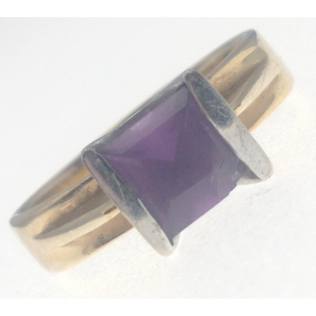 A 375 hallmarked yellow gold ring set with amethyst flanked with white gold. Stone has a slight chip. Size M and weighs 4.1g approx