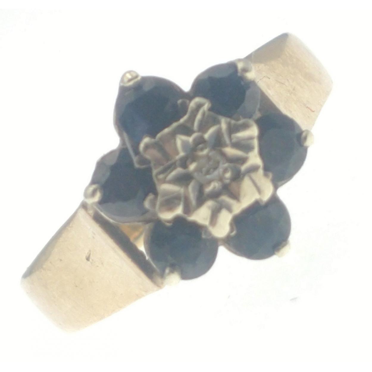 Hallmarked 375 yellow gold ring with central diamond (tested) surrounded by 6 dark coloured blue stones. Size N and weighs 3g approx