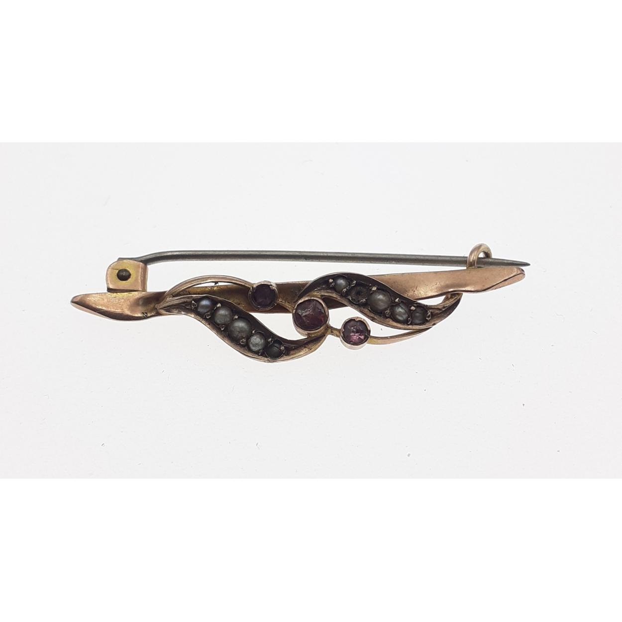 A fully Chester hallmarked possibly 1910, bar brooch set with seed pearl and garnets. One pearl missing, has a replacement steel pin. Gross weight 1.35g approx, length 37mm