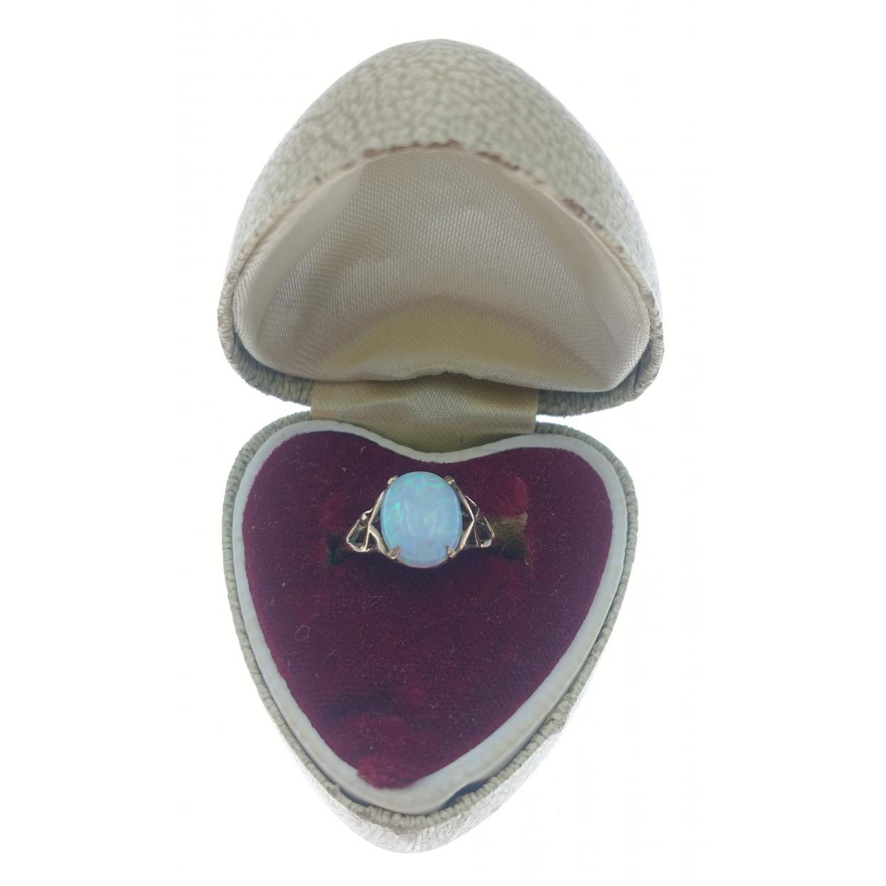 A lovely 9ct stamped gold ring with a beautiful centre Opal. Size M. Gross weight.1.4g. Opal 9mm approx and clean with no flaws or chips. Presented in a heart shaped ring box.