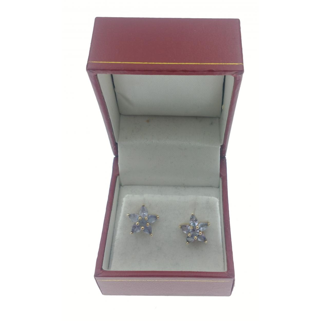 Beautiful 10K stamped gold earring with floral array of amethyst coloured stones. 1.4g gross. All stones intact, a lovely set in box.
