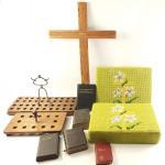 Church memorabilia to include 2 vintage wooden communion wine trays (42x18 and 31x18cm approx) one with silver plated handle, a plain wooden cross (65 x 41cm approx), 2 tapestry kneelers (36 x 26 x 8cm approx), few stitches missing, 3 leather bound King James bibles, 1 Gideon's New Testament, and 1 x 1984 translation of the Scriptures