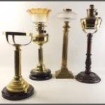 Collection of 4 oil lamp bases to include 3 brass, 1 wooden. Tallest: 55cm approx
