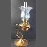 Stunning brass oil burner table lamp with unusual design, chimney and blue glass shade. Burner marked "British made". Overall height: 60cm approx