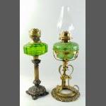Two oil lamps with green reservoirs. One with ornate antique brass stand standing approx 48cm approx, other on brass Corinthian style column