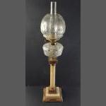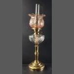 Brass turned style column oil lamp with glass reservoir, chimney and pink shade. Height including chimney: 70cm approx