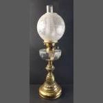Substantial embossed brass based oil lamp with chimney and globe shade. Burner dials marked with sailing ship. Height including chimney: 65cm