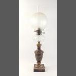 Dark oynx based oil lamp with chimney, glass reservoir and etched glass globe shade. Burner marked "Hinks & Son". Height including chinmey: 70cm approx. Crack to shade