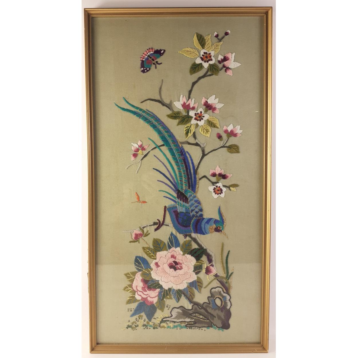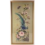 (408) A hand-worked embroidery of a bird of paradise with a butterfly and peony, frame measures 34cm x 63cm, backing needs restoration