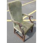 A green velvet high-backed armchair with scrolled arms measuring 66cmW x 108cmH x 66cmD