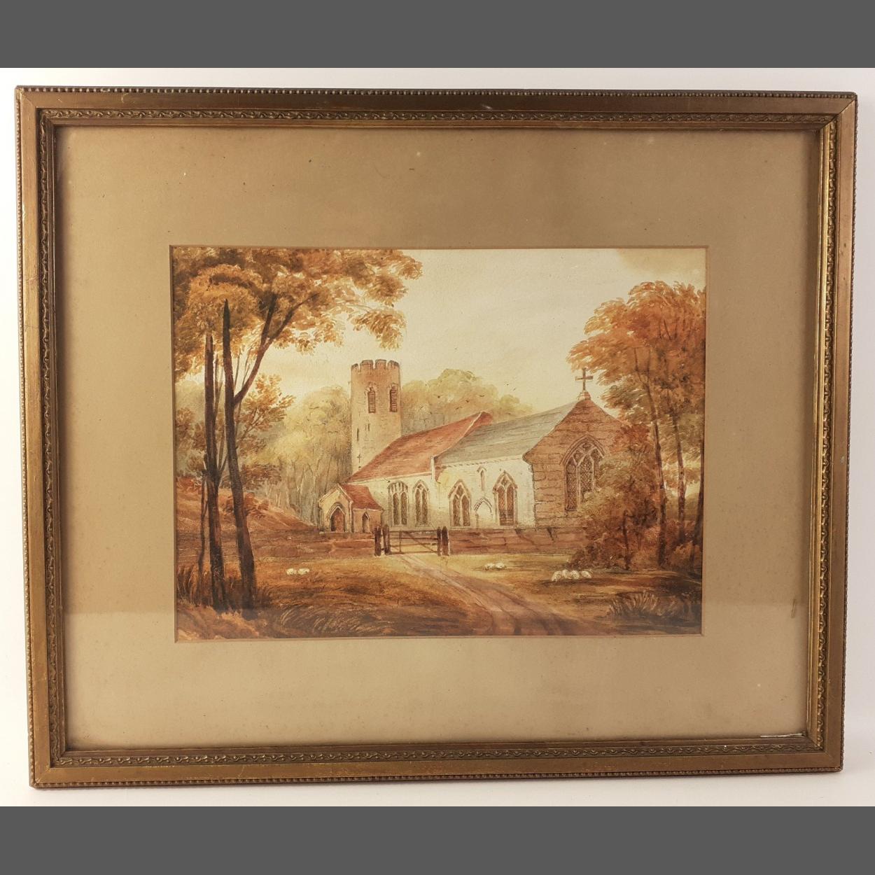 (3469) An original watercolour of an autumnal church scene frame size 45cm x 38cm, visible work 29cm x 21cm
