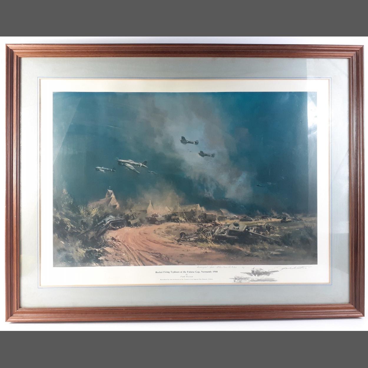 (2012) A print of 'Rocket Firing Typhoon at the Falaise Gap Normandy 1944 signed in pencil by FRANK WOOTTON (1911-1988) with a remarque pencil sketch of a Spitfire(?) dedicated to Alastair Ritchie and a letter addressed to Alastair Ritchie from Frank Wootton May 10th 1987 on the rear of frame, frame size approx 75cm x 58cm approx, visible work 56cm x 37cm