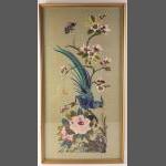 (408) A hand-worked embroidery of a bird of paradise with a butterfly and peony, frame measures 34cm x 63cm, backing needs restoration
