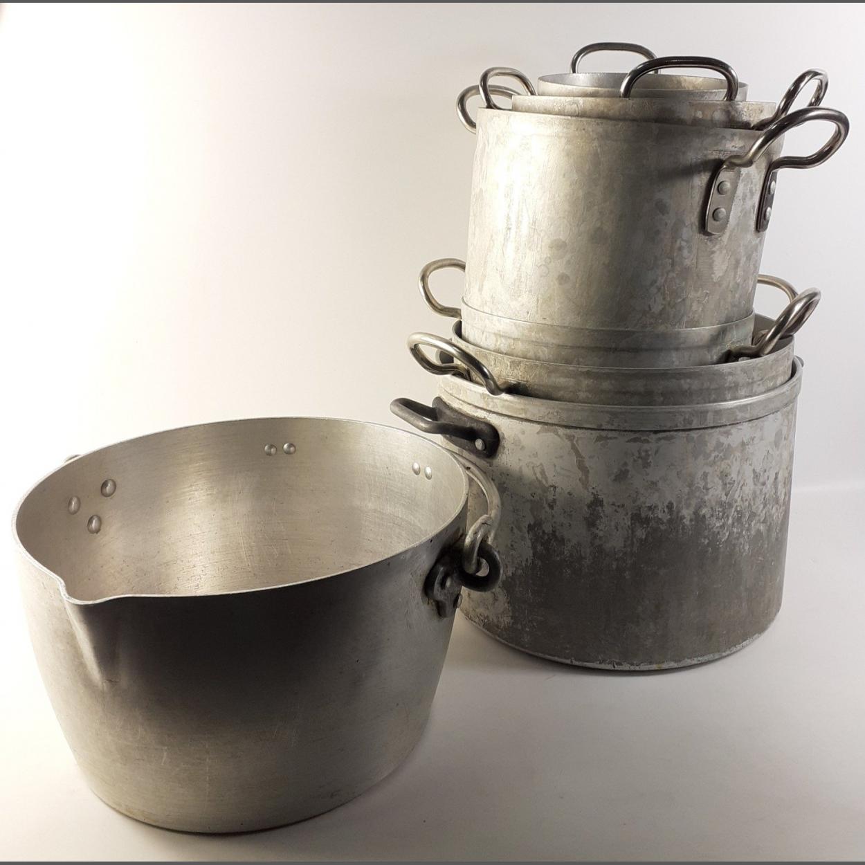 A mixed lot of 6 robust commercial kitchen pots in graduating sizes together with an aluminium jam-making pot. The largest pot measures approx. 32cm in diameter and 21cm in height, and the smallest measures approx. 17cm in diameter x 12cm in height. The jam pot measures approx. 30cm in diameter and 17cm in height.