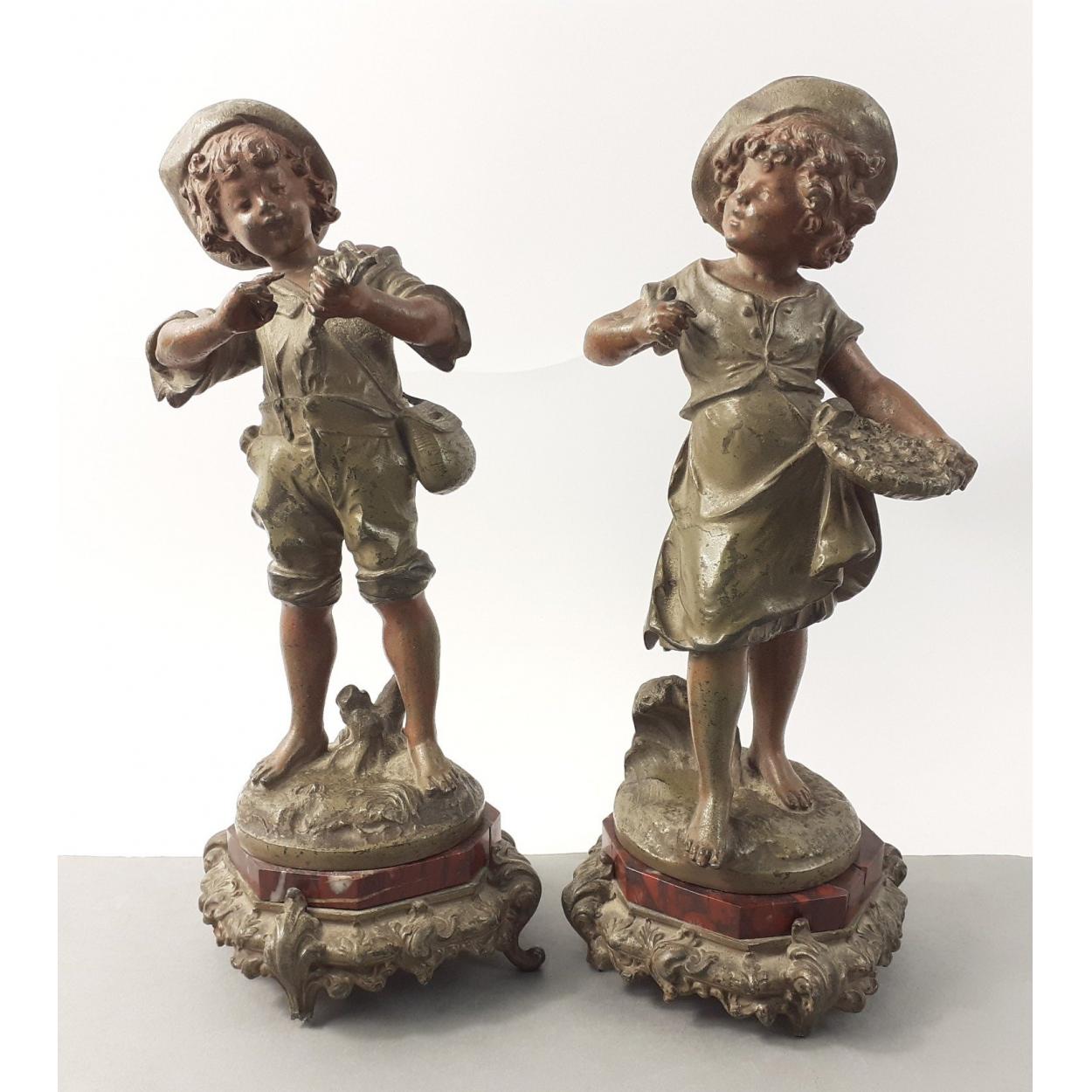 Two nice quality bronze statues of children each stamped Aug Moreau (Auguste Moreau 1834 –1917). Each stands 24cm approx on plinth. Figures do need to be re-attached to the bases and the marbled plinths do have damage. The figures are in good order, the boy is holding a frog. A very appealing pair.