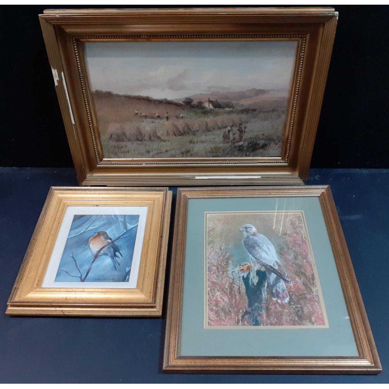 Three VINTAGE artworks to include 2 bird pictures and a countryside scene