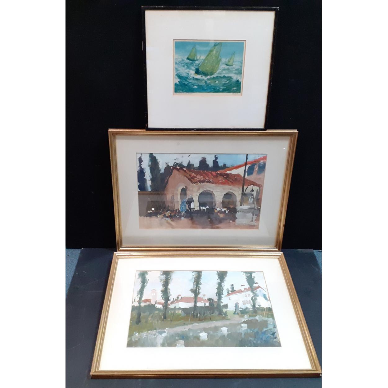 Two original guache paintings by O MOULES of country farm scenes, one titled "Poplar-Fiesso D'artico" frame size 76x59cm, visible work 54x37cm approx plus "Fishing Fleet Returns" and original acrylic painting by TB SMITH in a simple frame 49x45cm approx, visible work 27x20cm approx