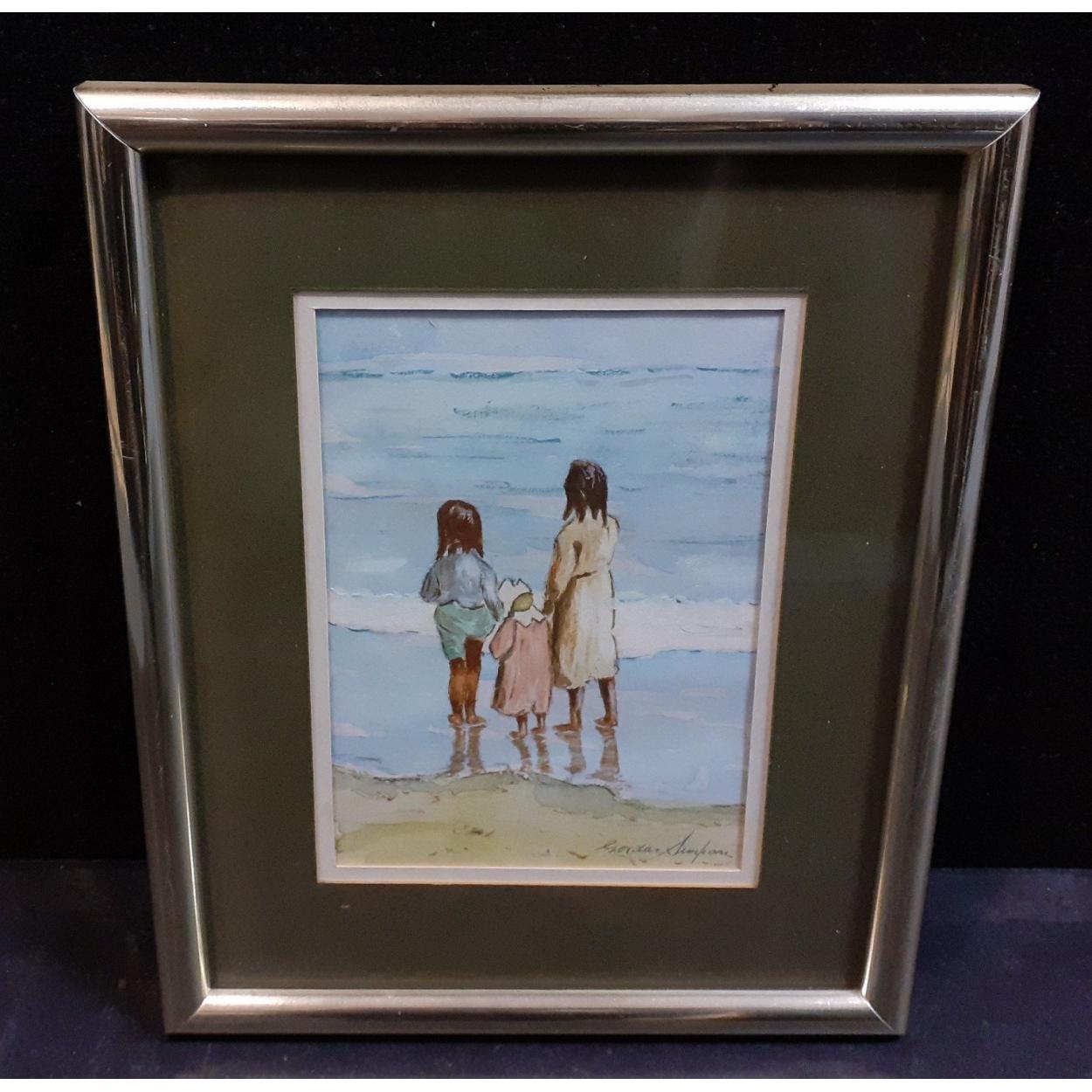 An original watercolour by GORDON SIMPSON, entitled On the Beach and presented at Arbroath Art Society exhibition 1985, frame size 28x22cm approx