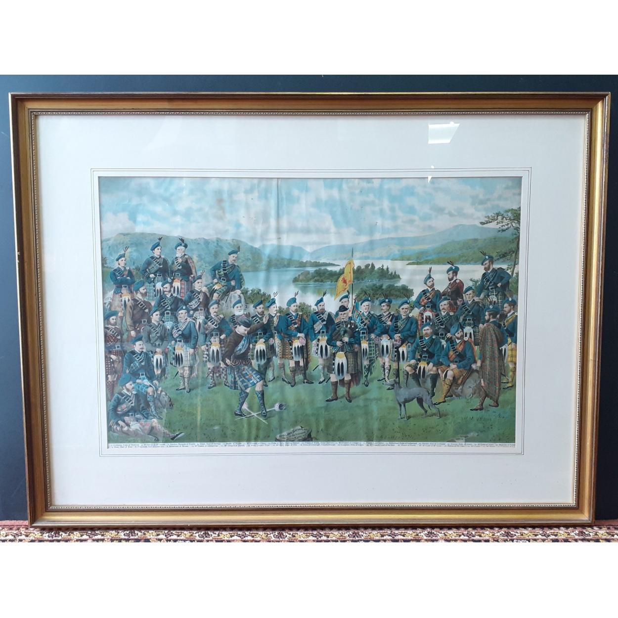 SCOTTISH CLAN INTEREST! - A large coloured lithograph 'Highland Gathering' in the TROSSACHS Loch Katrine - uniquely all figures in the painting are named which is most interesting! Dimensions 70cm x 48cm approx