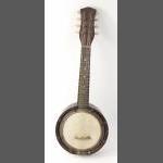 An antique English made 8 string banjolele with skin centre bone tensioners and mother of pearl inlay to the frets. A lovely item.