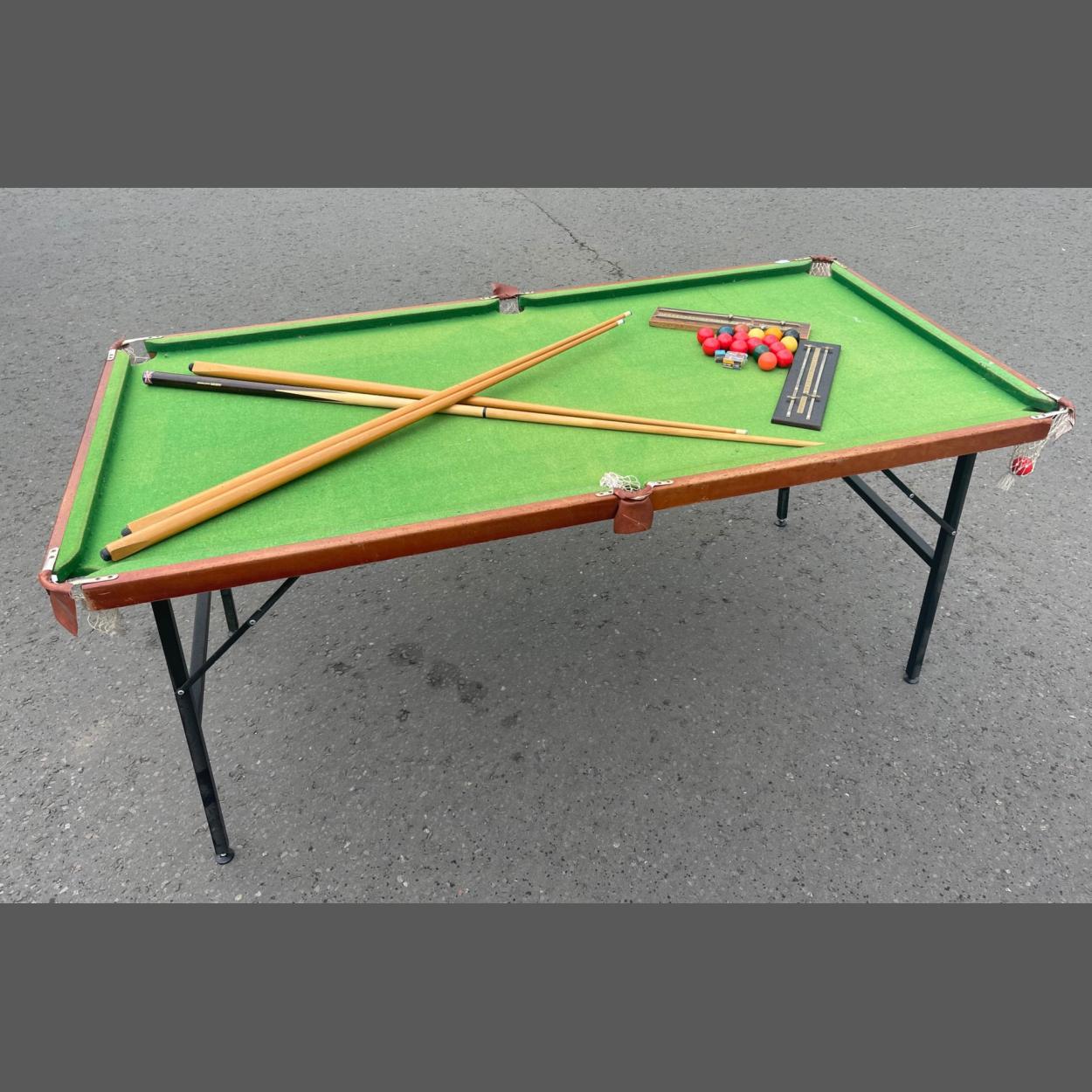 A super folding pool table, with 4 cues, scoreboards and a part set of balls. Decent size L188x W96xH84cm