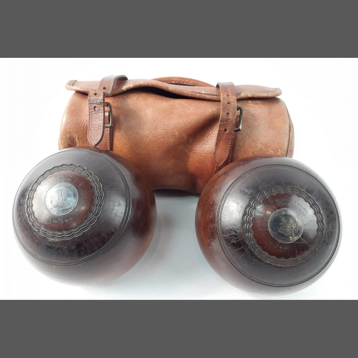 A pair of wooden bowls won by W Weatherhead in the Gordon Bowling Club Pairs competition in 1928 made by Thomas Taylor of Glasgow size 2, 3 bias. Come with leather carrying bag