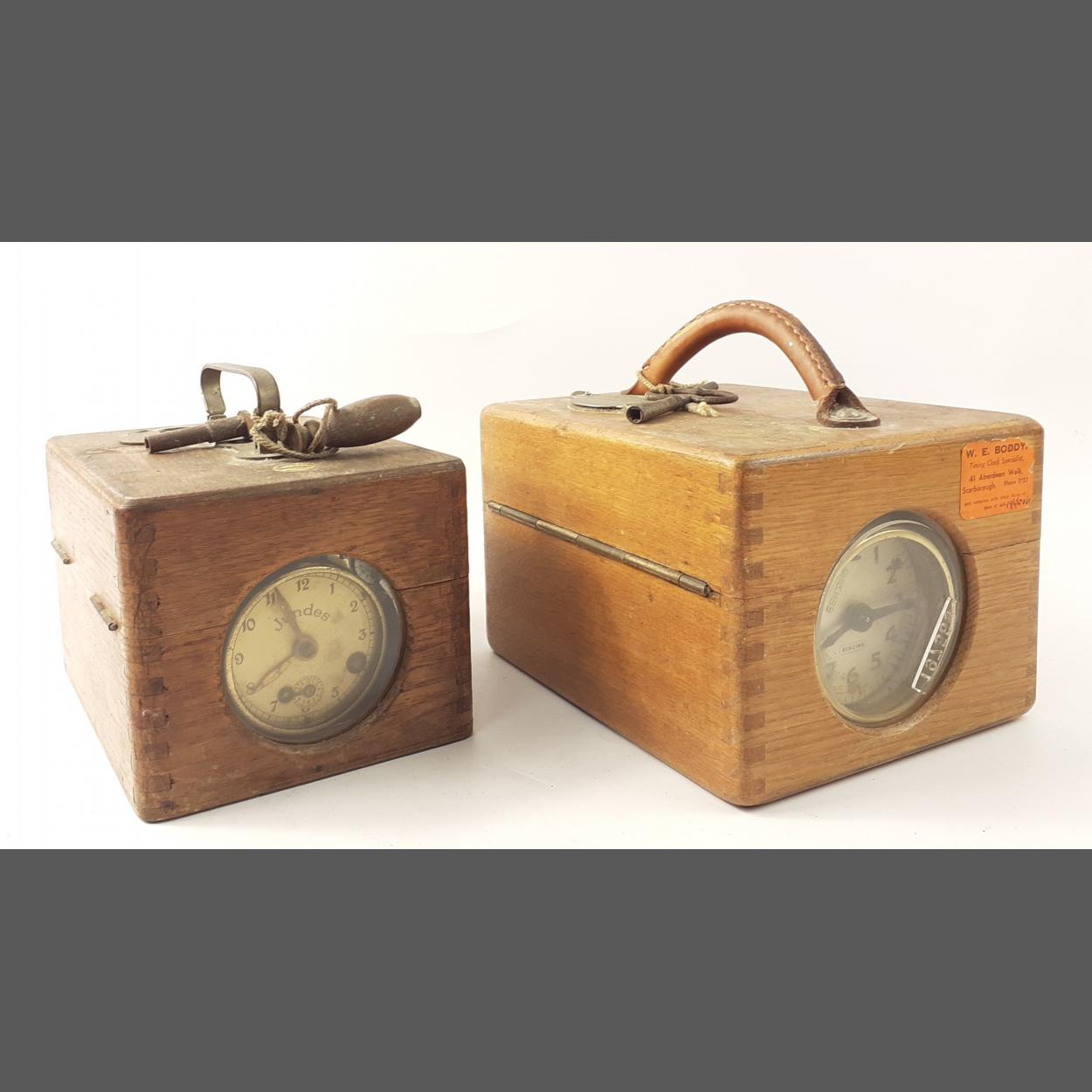 Two pigeon racing clocks by Thomas Hudson WE Boddy timing clock specialist Aberdeen Walk, Scarborough