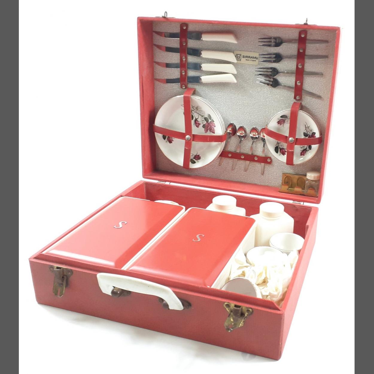 A very pretty HAWKER MARRIS SIRRAM Vintage picnic hamper set. 4 piece, 2 sandwich boxes, missing two condiment pots.