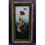 An antique Victorian painting on glass of pansies and daisies with a velvet mount and decorative frame. Measures 60x32cm approx