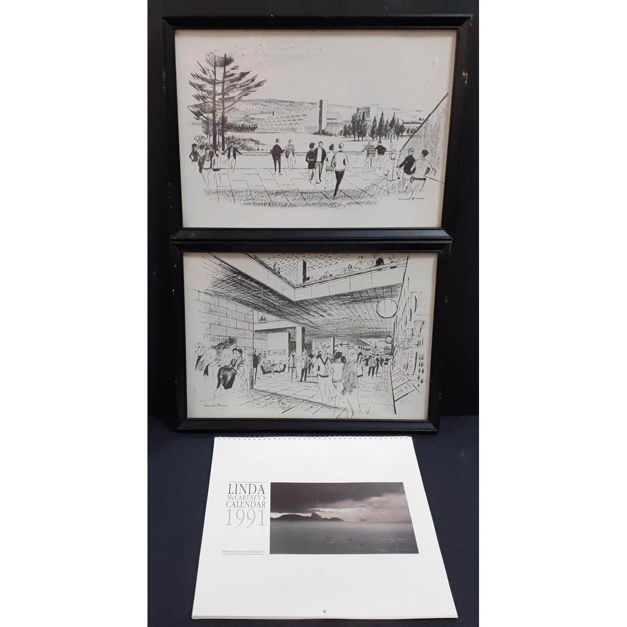 Two original ink architectural drawings by Kenneth Browne - each 45 x 33cm and a 1991 signed Linda McCartney calendar.