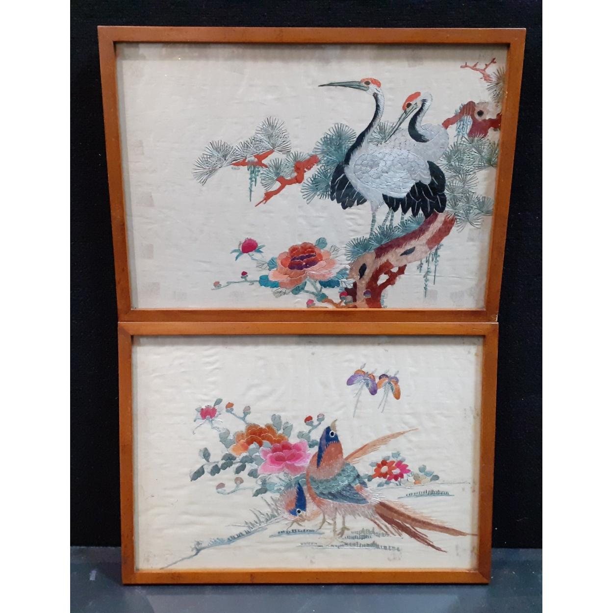 Two silk embroideries one of herons, the other of exotic birds, frame 41x30cm