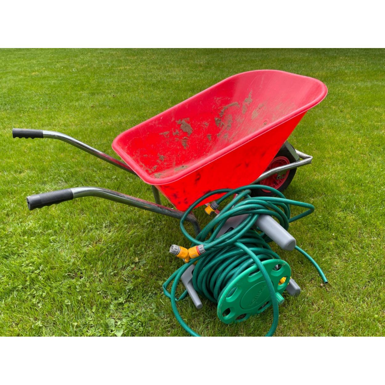 A REALLY HANDY plastic wheelbarrow plus a garden hose reel
