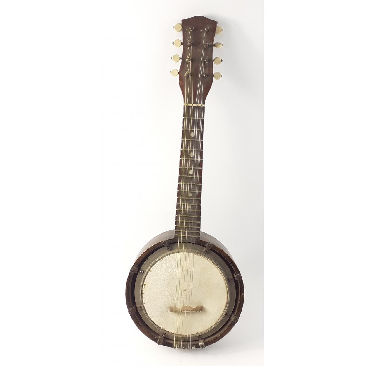 An antique English made 8 string banjolele with skin centre bone tensioners and mother of pearl inlay to the frets. A lovely item.
