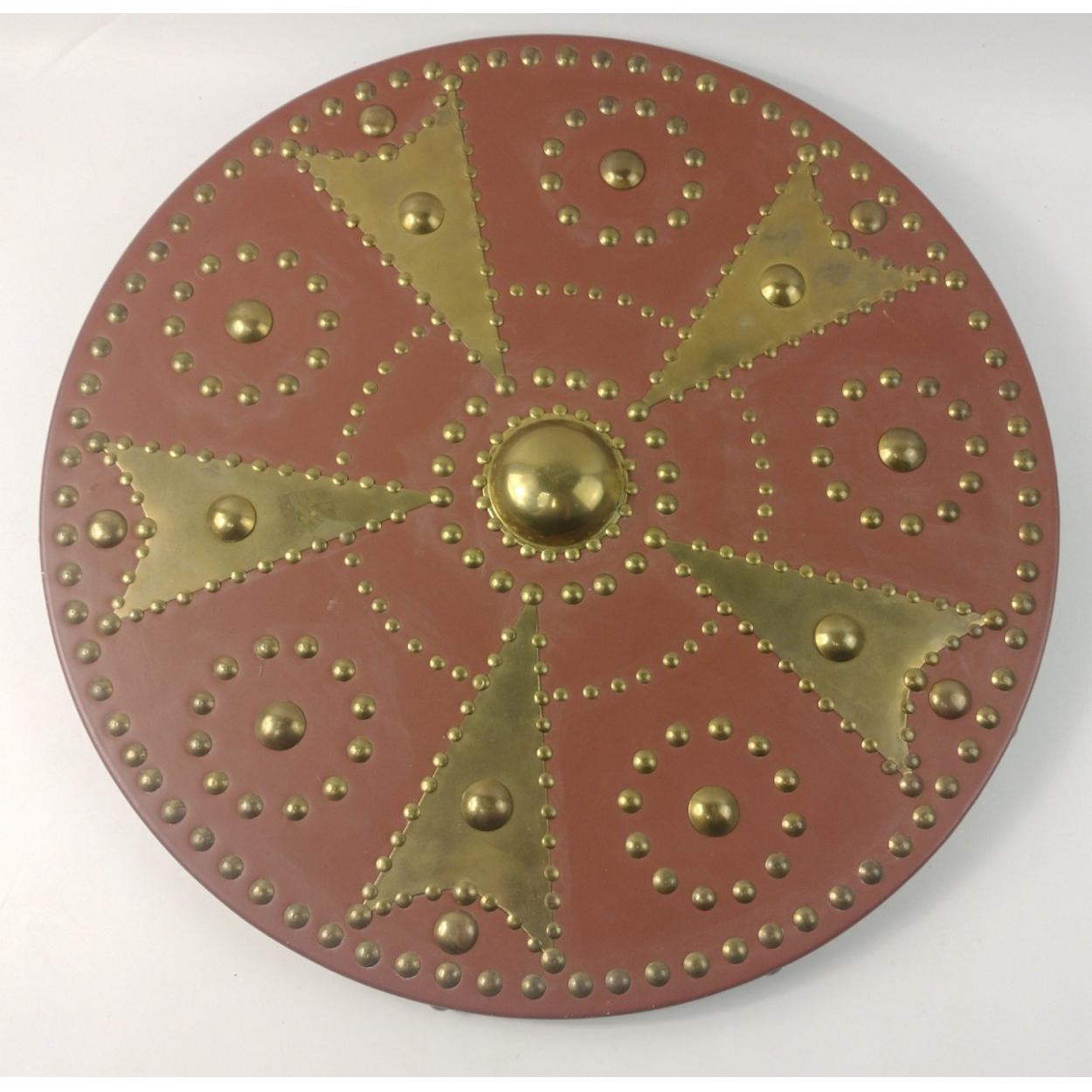 A modern well-made replica brass studded targe, with leather straps and cord to display. 46cm diameter approx. Good condition