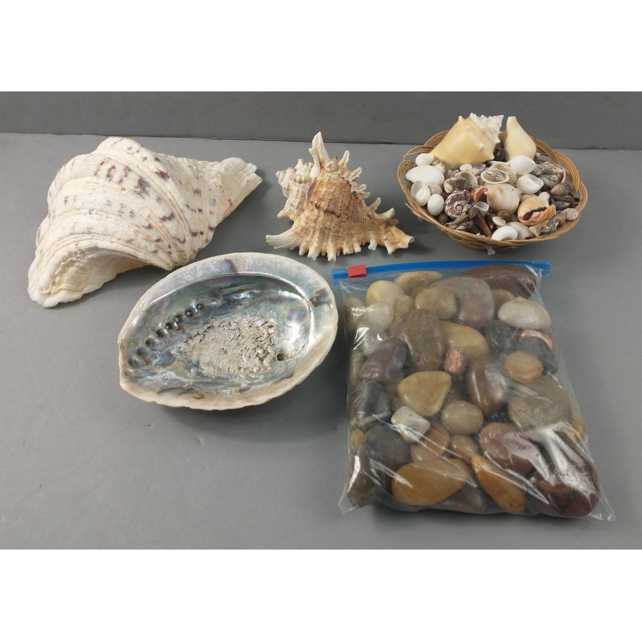 I SEE SEA SHELLS AT THE AUCTION HOUSE! A mixed lot of shells and polished pebbles including one abalone