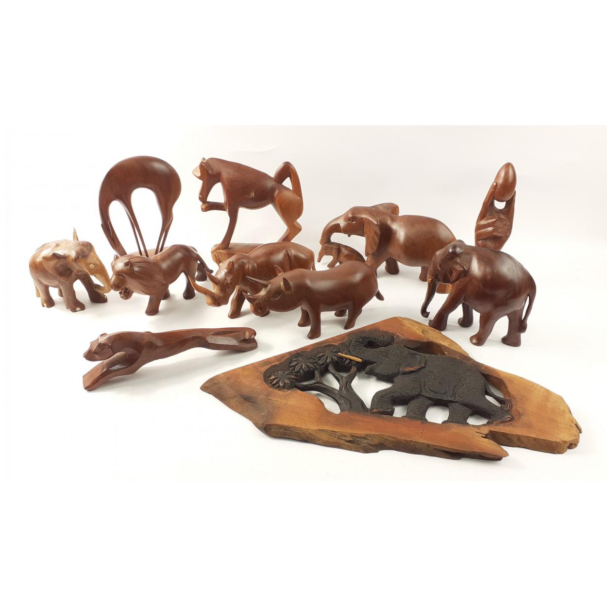 A collection of wooden African carved animals to include a lion, rhinos, elephants, gazelles and much more