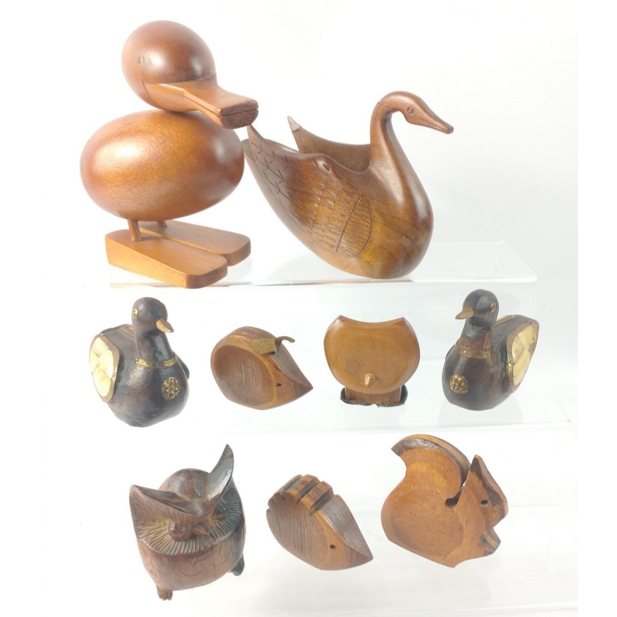 A collection of various ornamental wooden birds mainly ducks