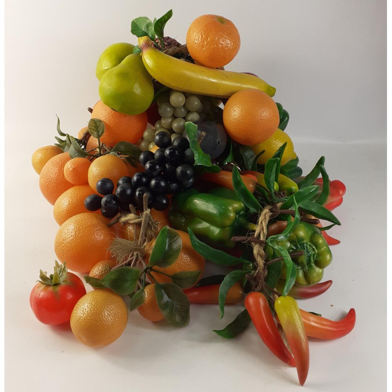 A large bag of artificial fruit including oranges, peppers, lemons and grapes