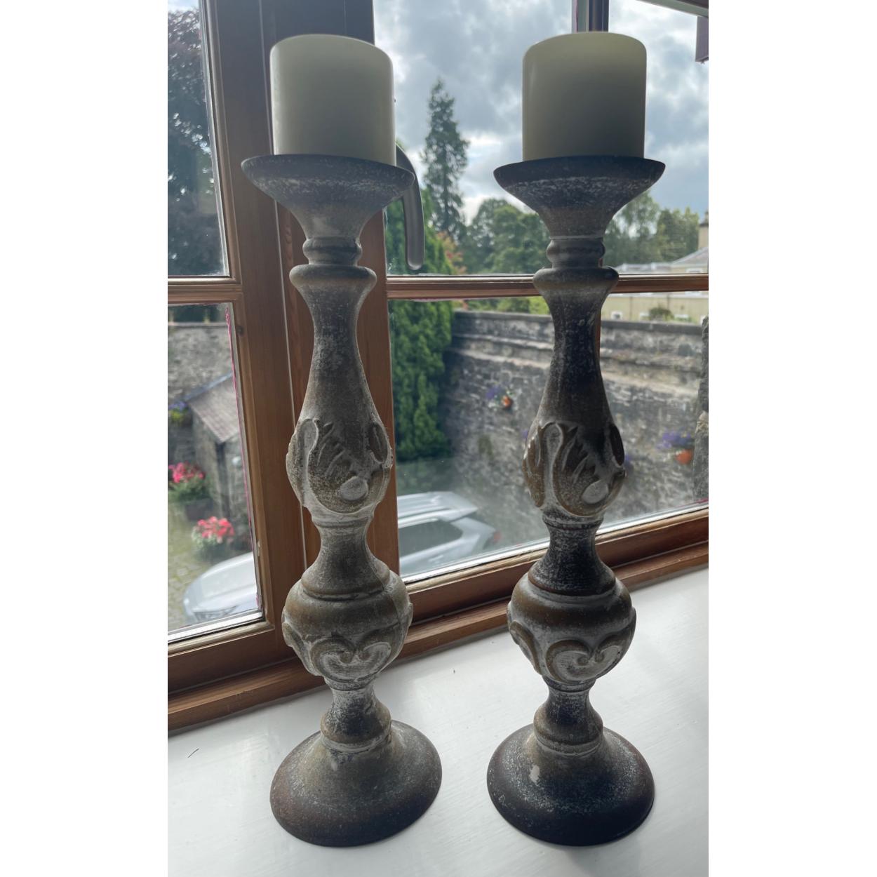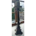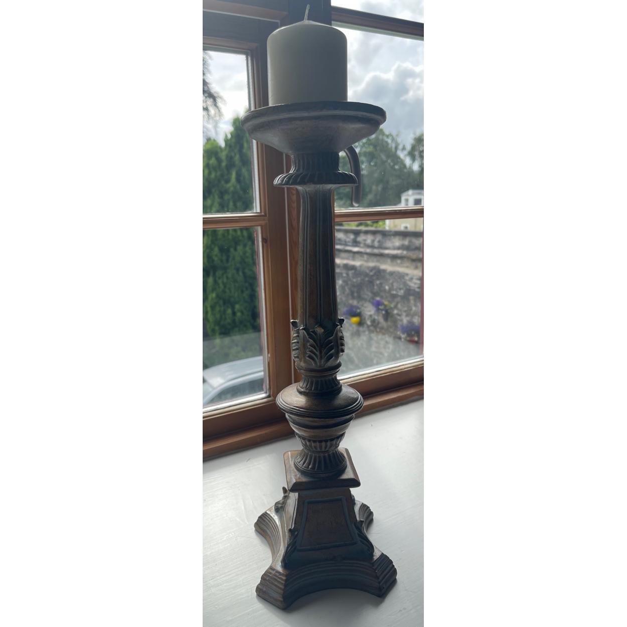 A nice tall FEATURE composite candlestick holder 43cm tall in distress greyish/goldish finish complete with a half-size church candle(9cm height approx)