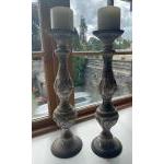 A pair of tall modern DISTRESS finished candle sticks with striking patterns on them complete with also two thick half-size 'church candles' - candle sticks height 40cm approx