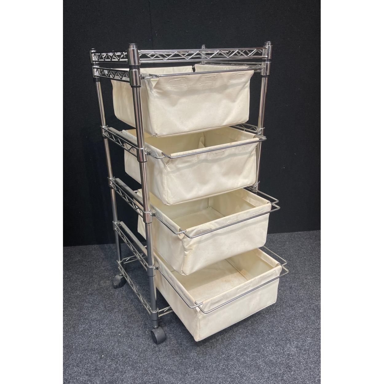 A four drawer mobile stainless steel storage unit with four canvas drawers 32x35cm diameter 90cm tall