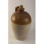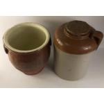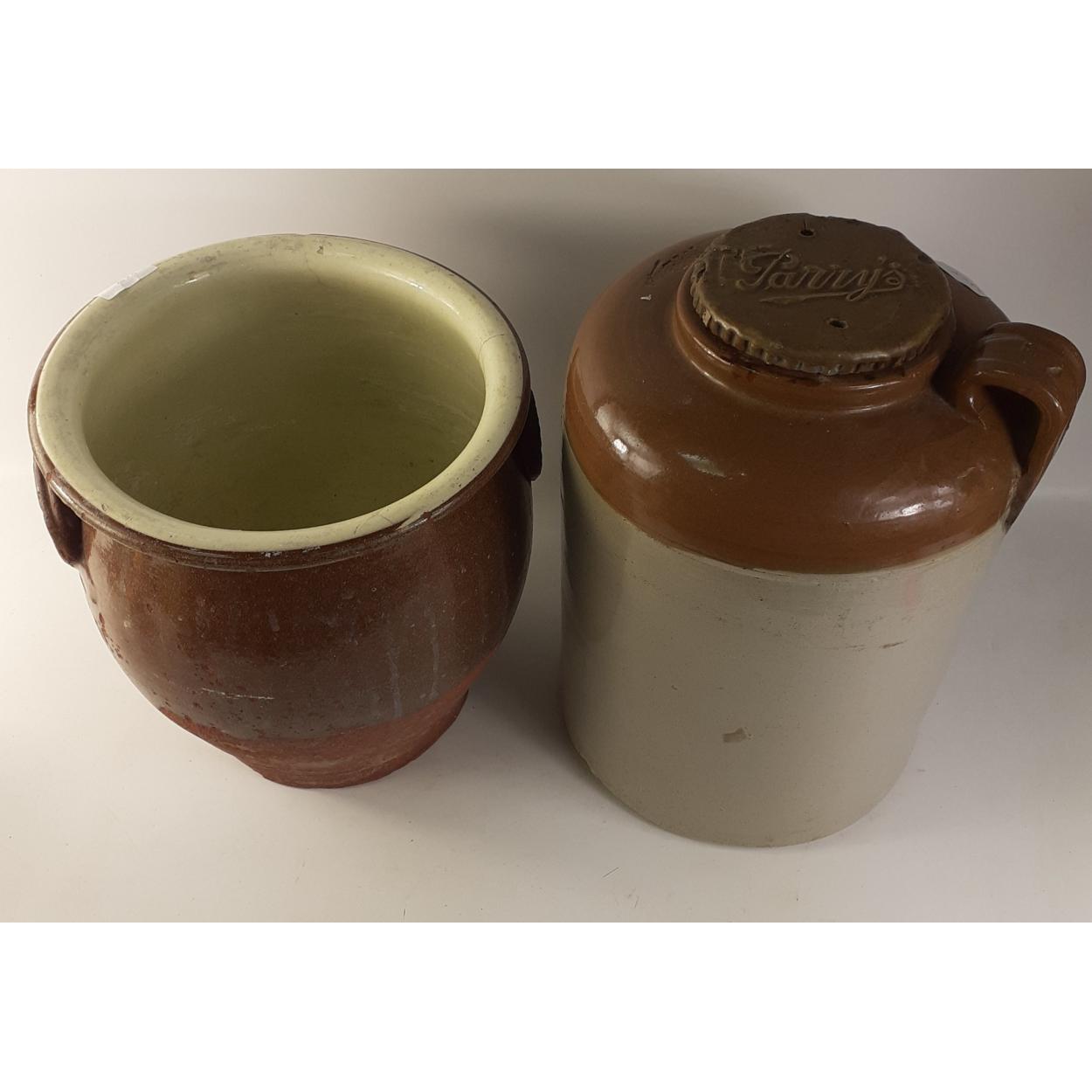 An unusual screw top flagon labelled PARRY'S standing approx 36cm high with some damage to the inner lid plus a large double-handled pot standing 28cm high with a chip from the lip and an historic crack