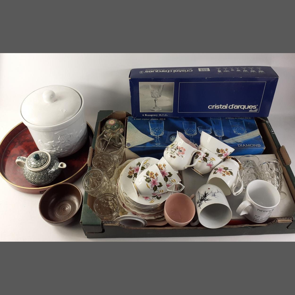 A mixed box to include a part ELIZABETHAN bone china tea service, 5 vintage blown glass bubble tumblers 10cm high, a box of 5 CRISTAL D'ARQUES wine glasses, box of stationery, etc etc