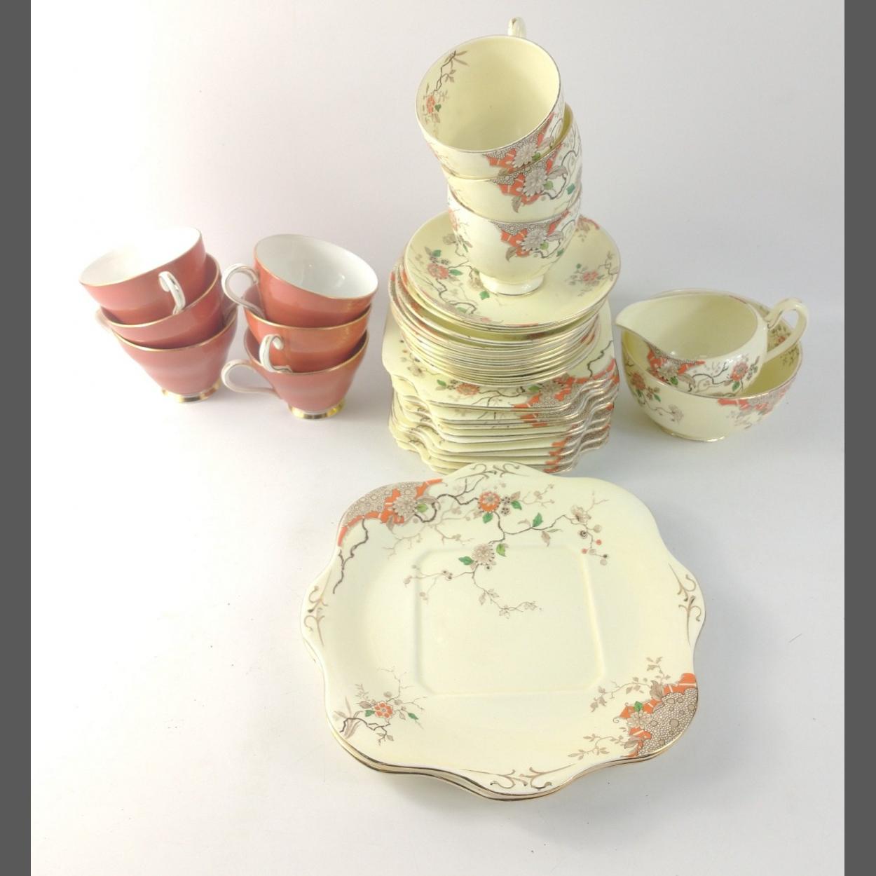 A GRAFTON part tea set comprising two large plates with a sugar and cream, 12 side plates, 11 saucers with three matching cups and six Royal Grafton orange cups that match quite well. 36 pieces in total. Generally good condition, cracked noted.