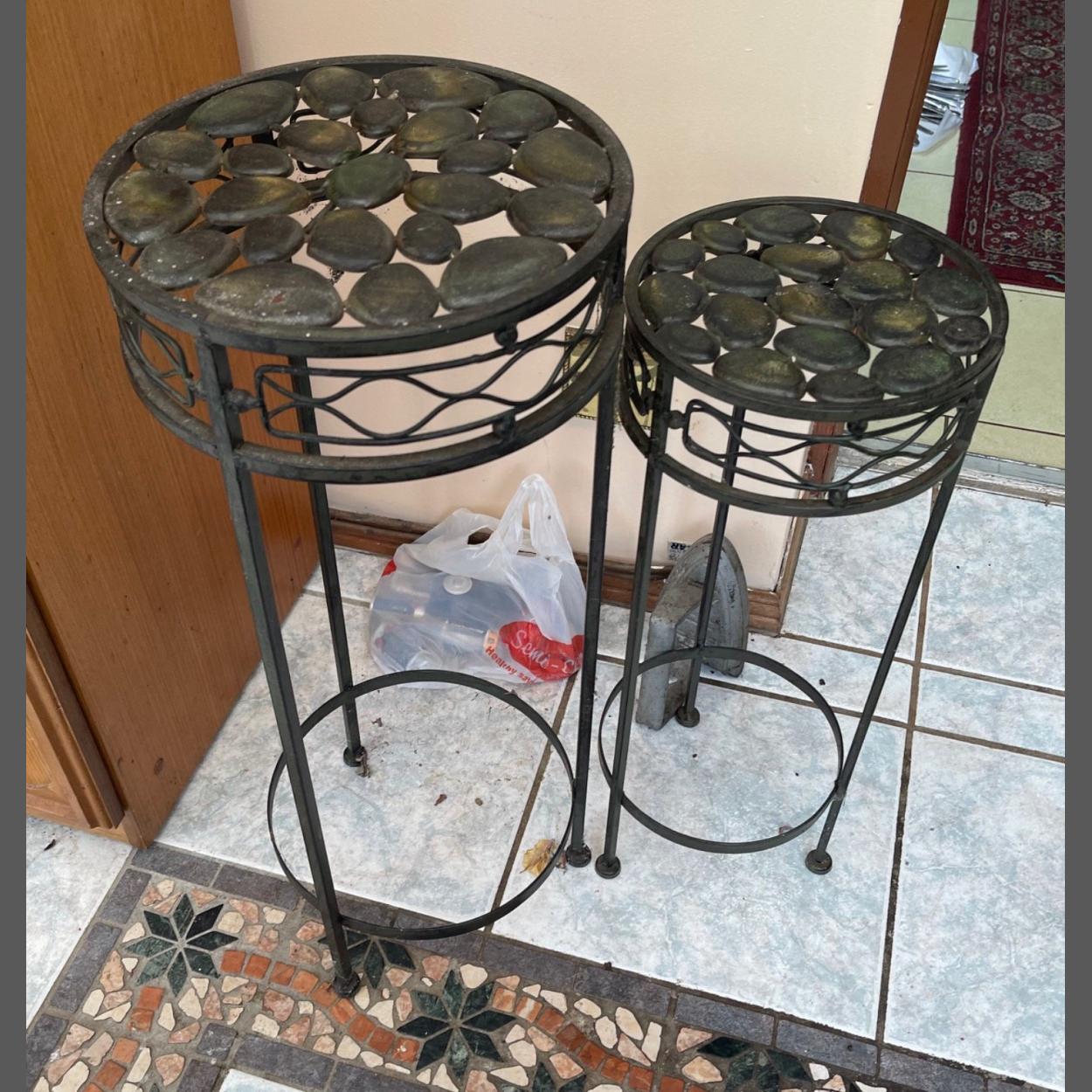 Two circular metal plant pot stands one 21cm dia, 55cm high and 27cm dia , 65cm high approx