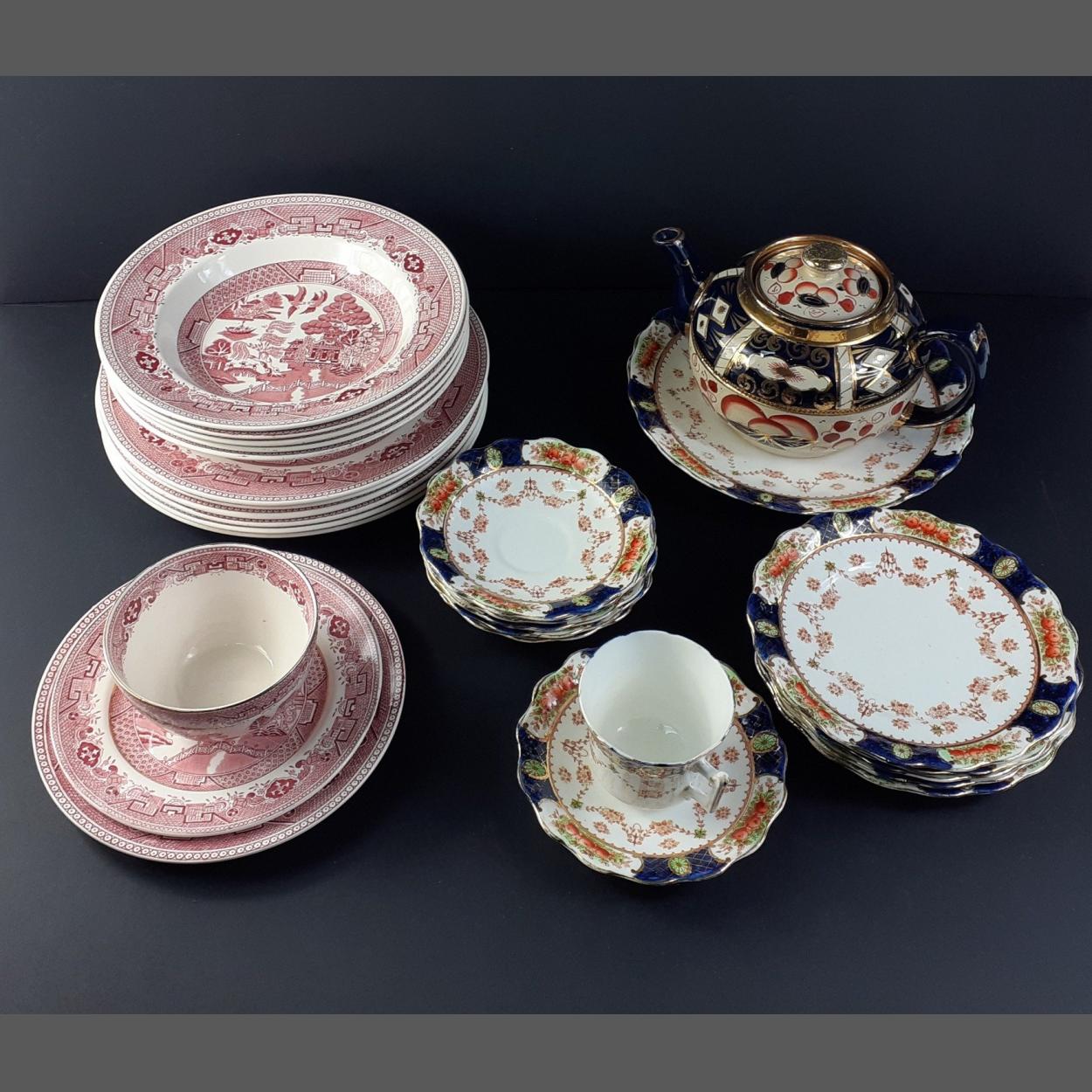 A part VICTORIA porcelain dinner service in the ever popular Willow pattern comprising 6 dinner plates, 5 soup bowls, 1plate dia 20cm, 1 plate dia18cm and 1 sugar bowl. Also a part WELLINGTON tea service to include 1 teacup, 6 saucers, 5 side plates, 1 teapot with underplate. Some wear to the gilding but otherwise good condition